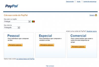 De seguida irá aparecer esta página. É apenas preciso escolher o país e o idioma. Depois consoante o uso da conta é necessário escolher um dos três tipos de conta: