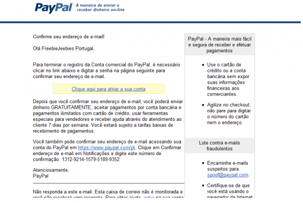 De seguida irá receber um e-mail semelhante à imagem na sua caixa de entrada. Clique em “Clique aqui para ativar a sua conta”. Ou então pode aceder ao PayPal e confirmar usando este código.